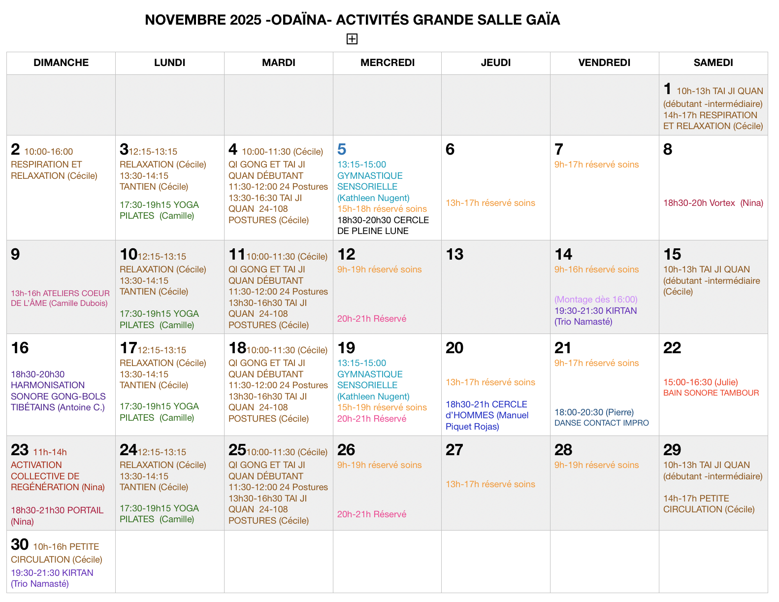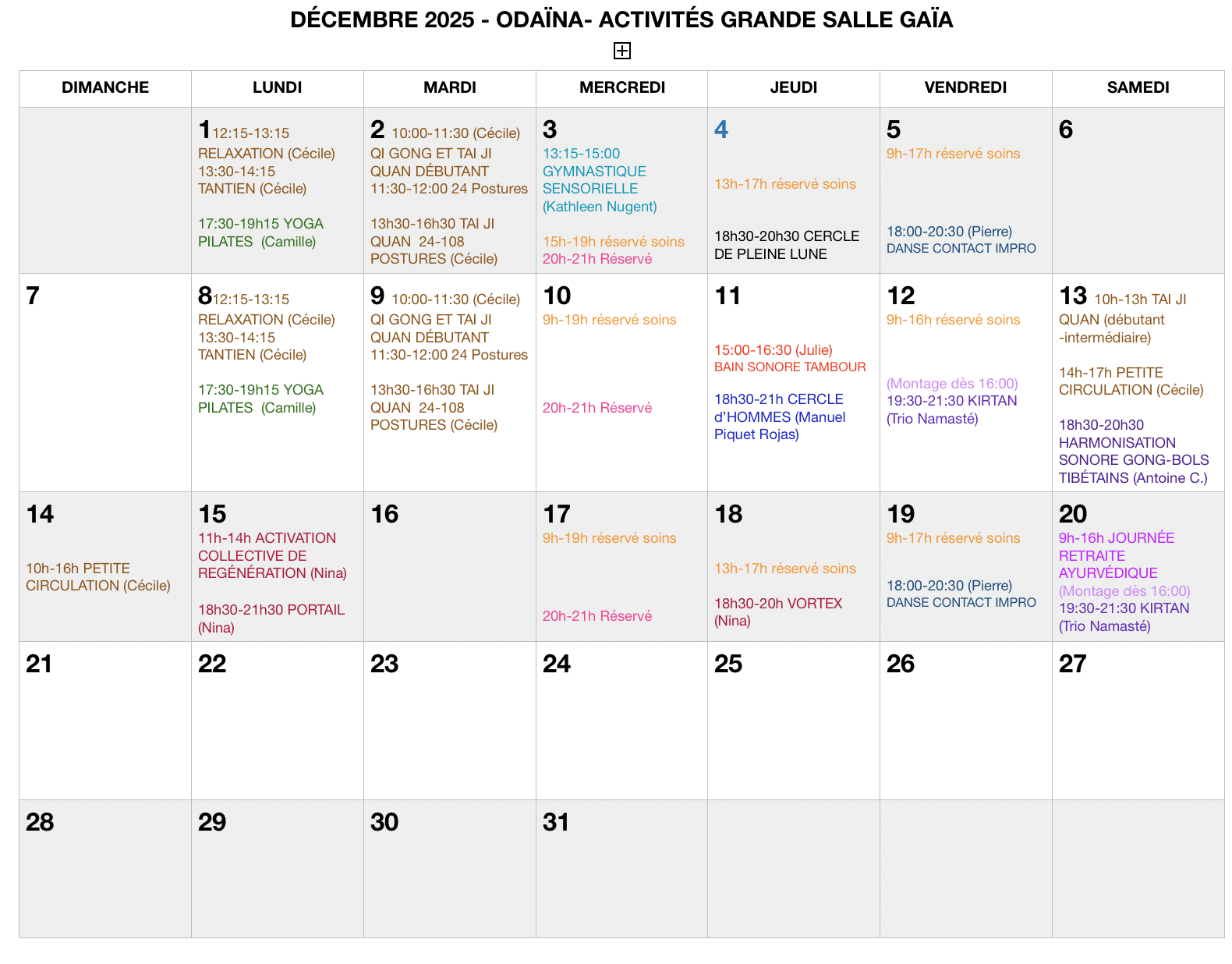 - Lundi, 12h15 à 13h15, Relaxation avec Cécile Colson -hebdomadaire du 15 septembre au 8 décembre incl. 2025