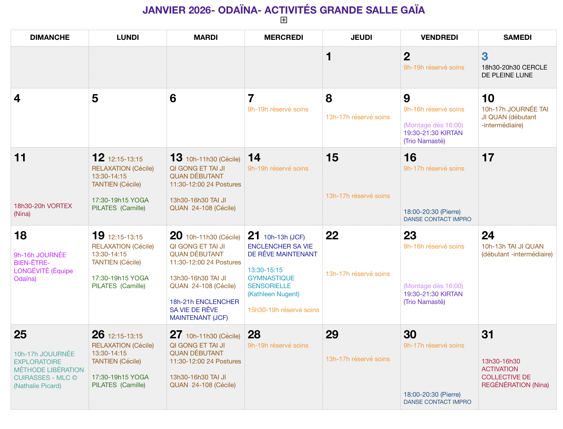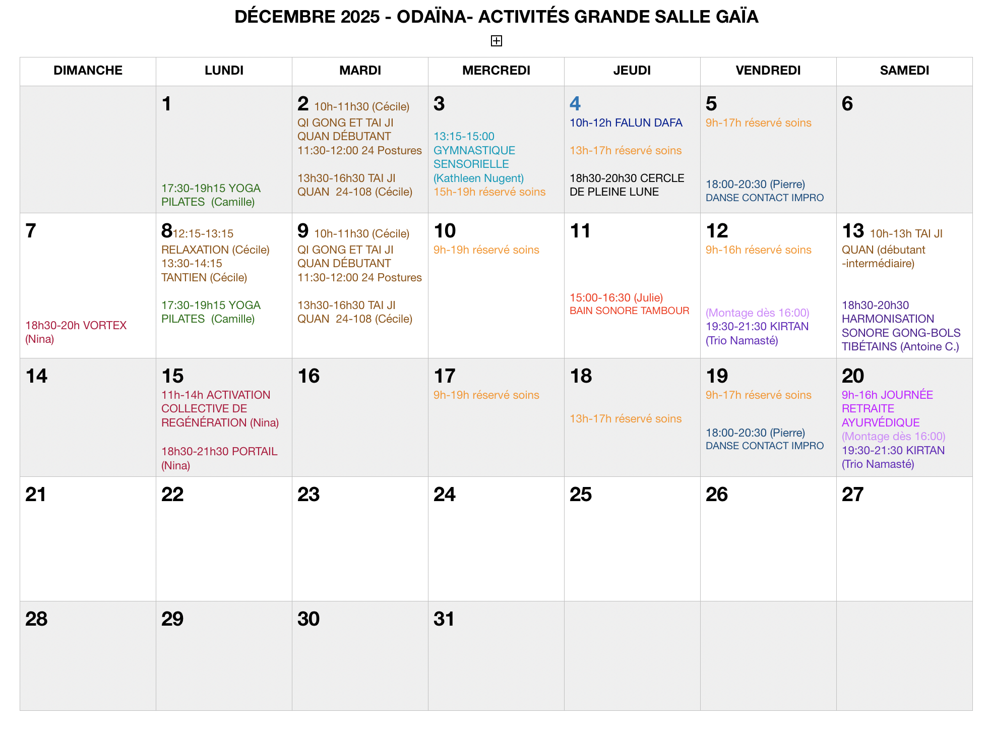 - Lundi, 12h15 à 13h15, Relaxation avec Cécile Colson -hebdomadaire du 15 septembre au 8 décembre incl. 2025 (pause 1er déc)